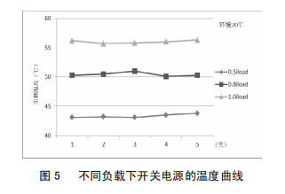 改進后,為驗證改進效果,對開關電源分別在0.5倍、0.8倍及1.0倍負載下進行了為期5天的帶負荷試驗,圖5為不同負載下開關電源的溫度曲線,由圖5可知,隨著負荷的增大,開關電源問題總體呈上升趨勢;負載不變的情況下,同一溫度曲線基本保持平滑;開關電源在額定負載下運行,最高溫度不超過57℃,未達報警值,開關電源可靠性得到顯著提高。